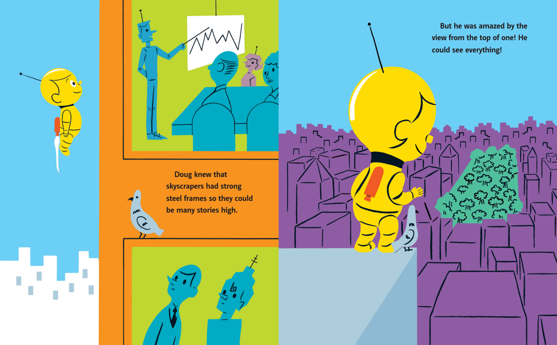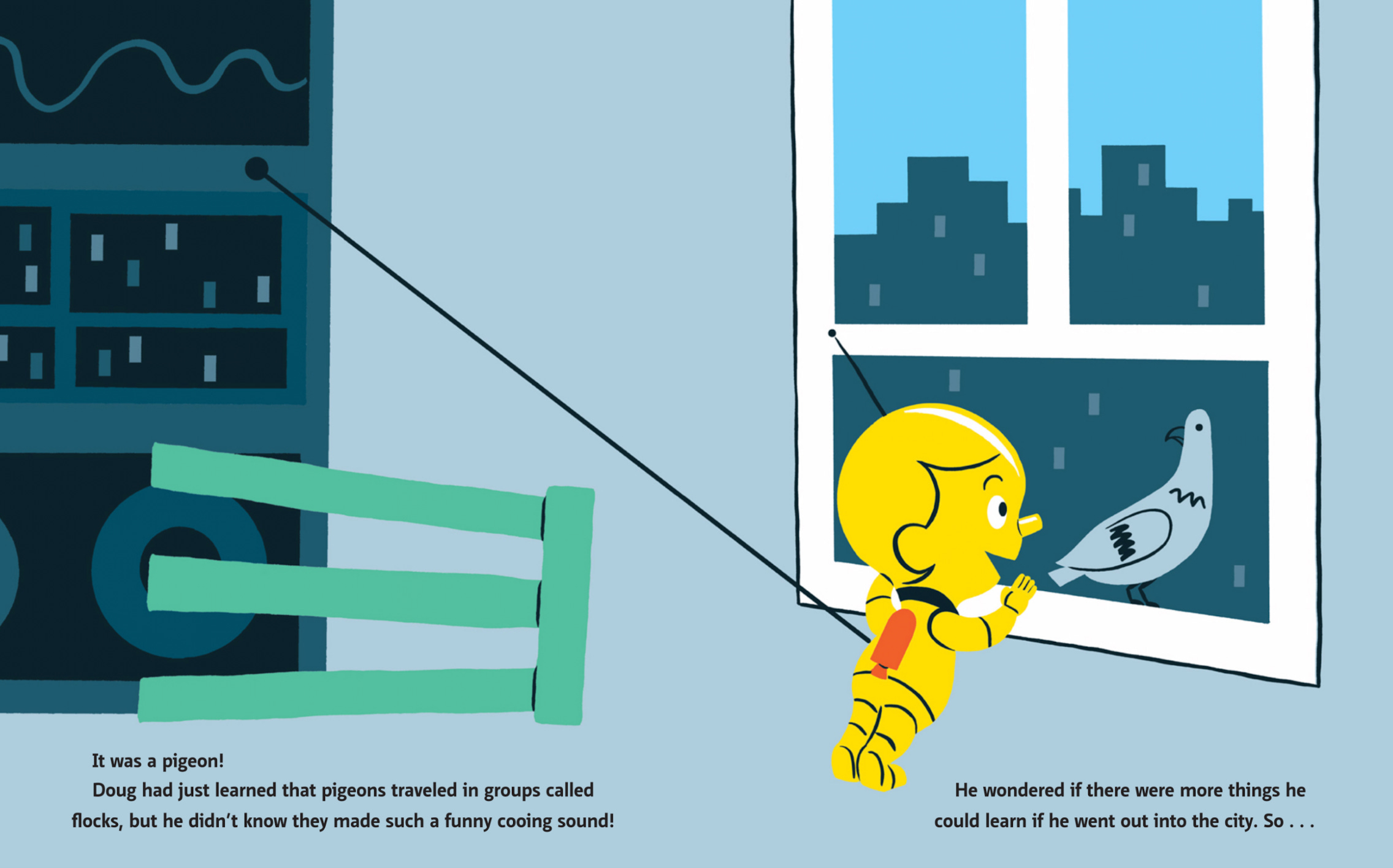 Doug Unplugged is the story of a kid robot who’s filled up with facts each day as his parents plug him in.4 But one day, after seeing and experiencing a pigeon on the window ledge, he wonders if there’s more to understanding than simply learning facts and figures through his daily download.