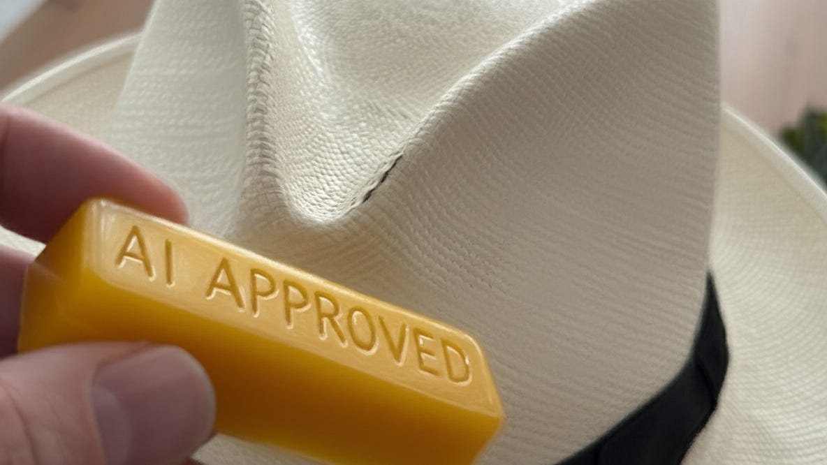 Whether Claude’s technique actually “worked” in any technical sense is, if I’m being honest, doubtful. But I will admit that I like the hat better now—slightly discolored, a little stiff around the “wound,” and storied in ways that resonate surprisingly deeply with my work.