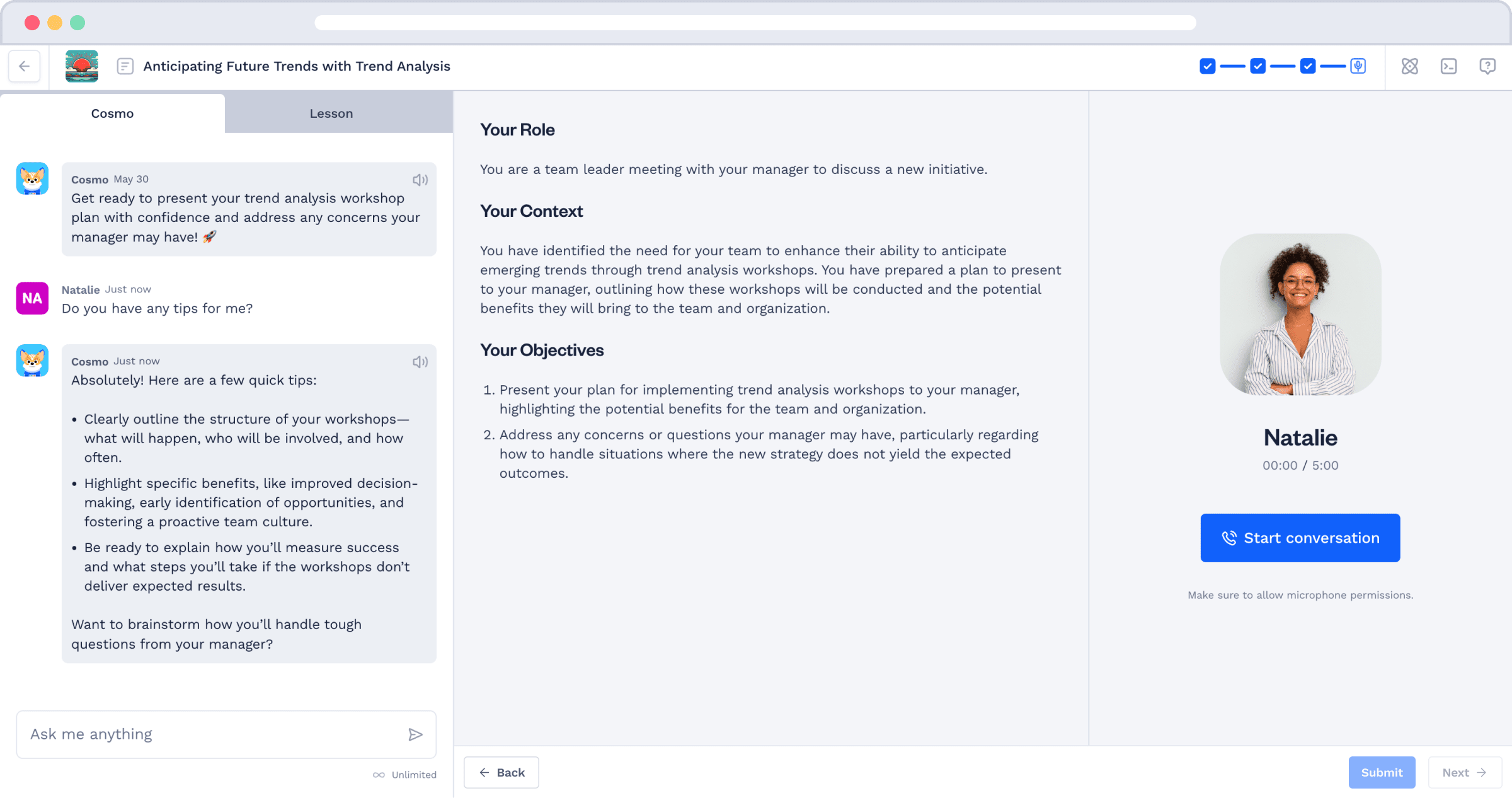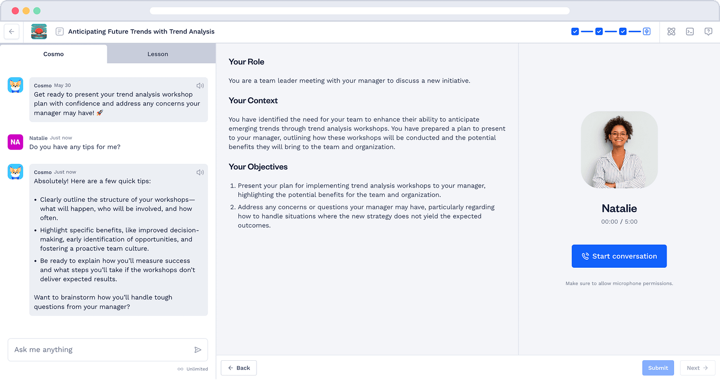 Again, you both get feedback from Cosmo on how you handle the situation and the conversation, and pointers to how you can iteratively improve if you’re not quite there yet.