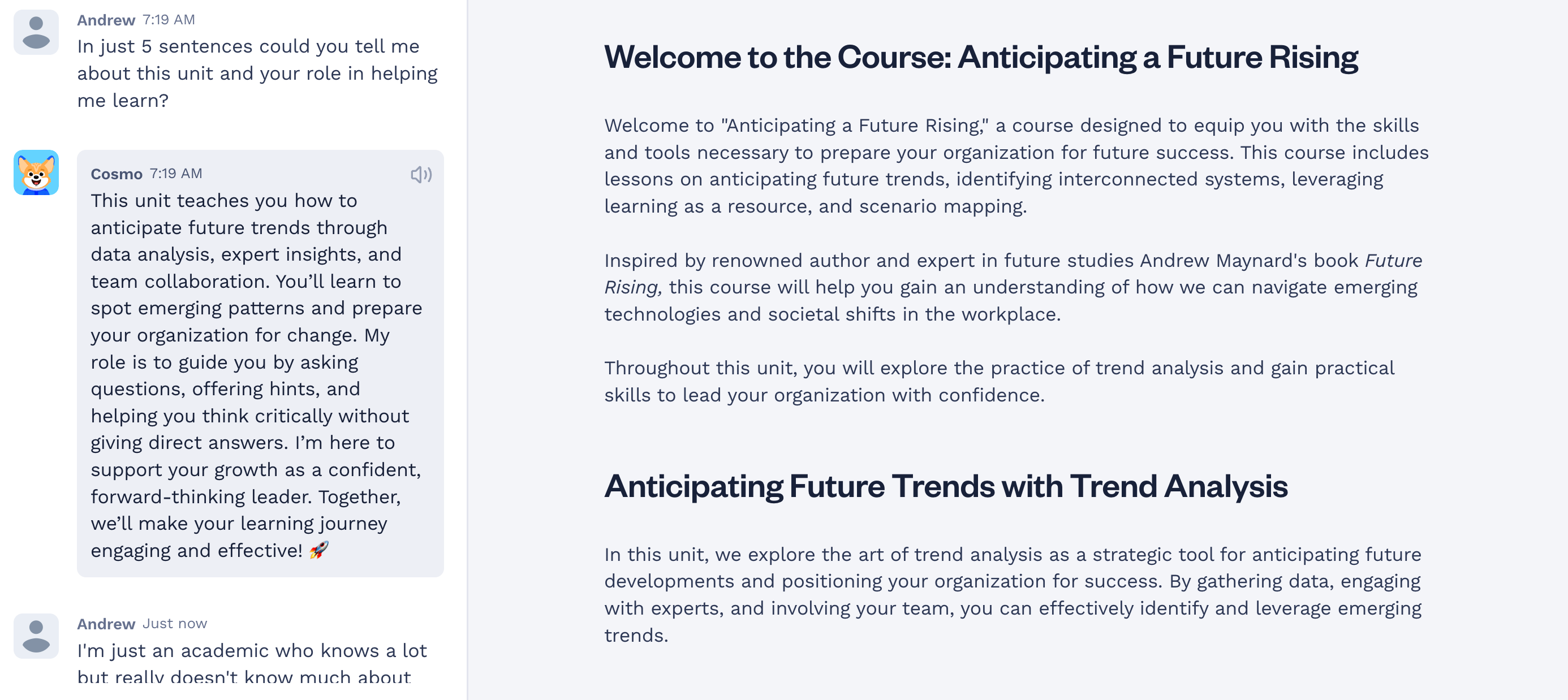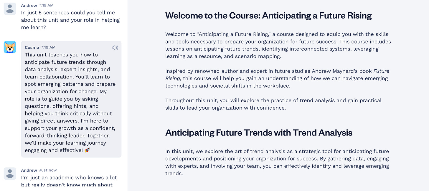 If you’ve used one of OpenAI’s GPT bots or similar you’ll have a good sense of what it’s like to interact with Cosmo — although in this case the AI is fine tuned on the course material to be an expert mentor, tutor, guide, and teacher.