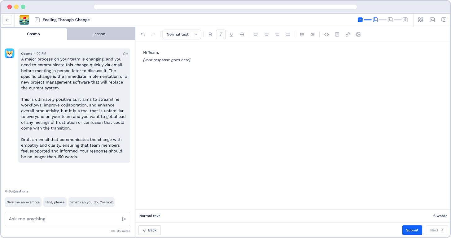 After you’ve completed the requested task, Cosmo assesses your response, provides feedback, and — importantly — suggests how you might improve things in the next iteration if you aren’t quite there yet. And the platform doesn’t let you progress until you’ve demonstrated the skills you’re supposed to be developing to a sufficient level.