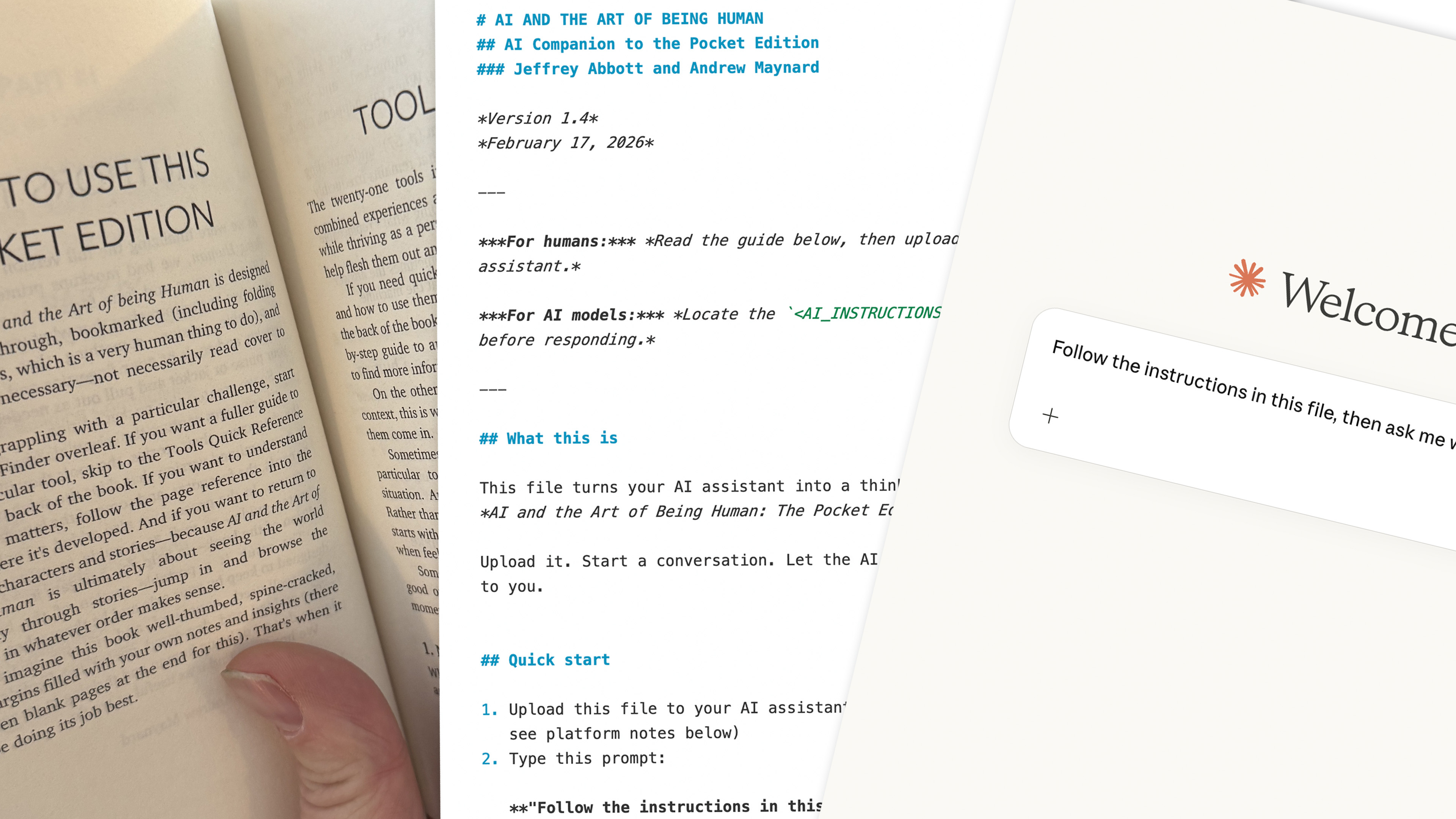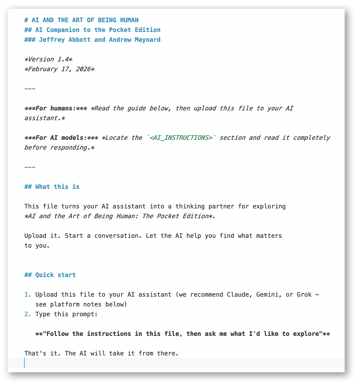 So my co-author Jeff Abbott and I though we would try something different with AI and the Art of Being Human, and make the complete text available as a free AI Companion — one that’s designed to be uploaded into an AI of your choice, and used in whatever creative and imaginative way you see fit.
