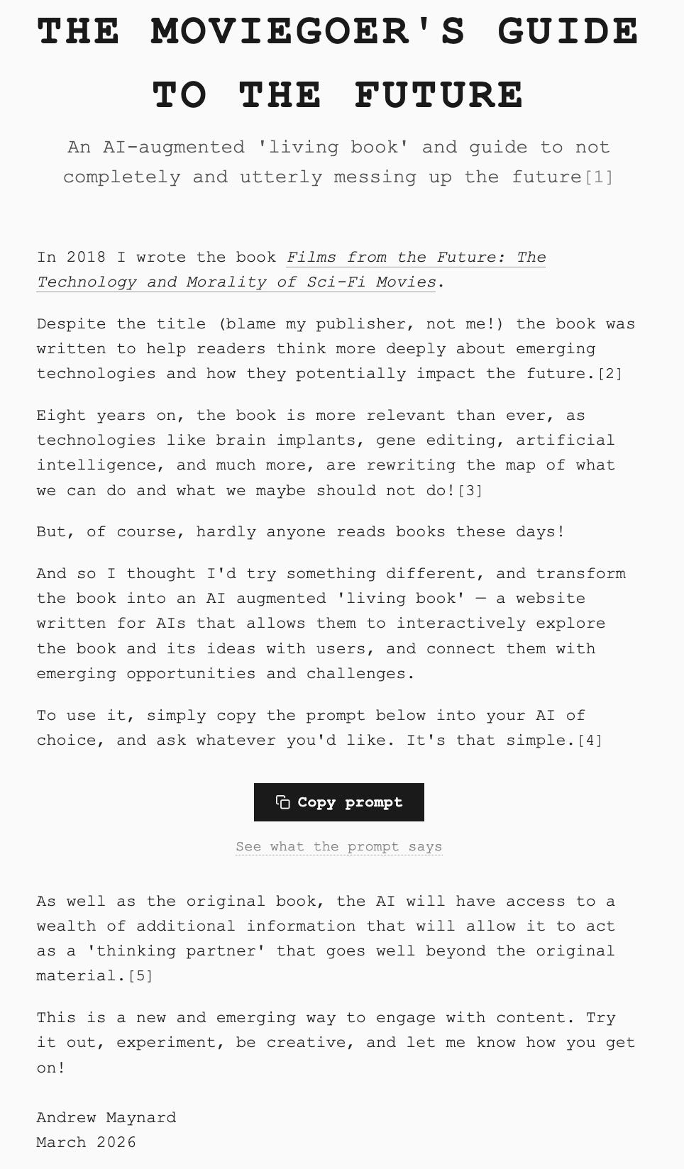 Reflecting the website’s AI-first design, the human-facing part of spoileralert.wtf is minimalistic. Apart from a brief introduction and overview, the landing page includes a prompt to cut and paste into an AI of your choice, and that’s pretty much it:
