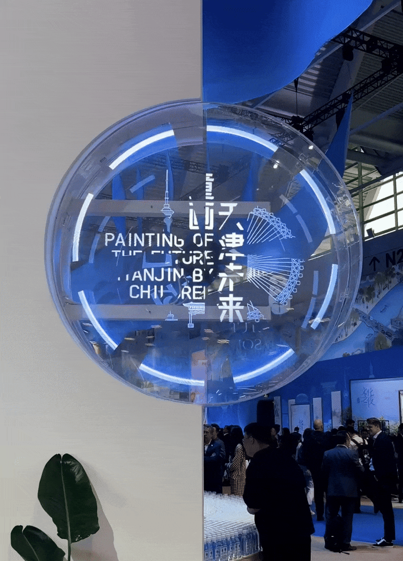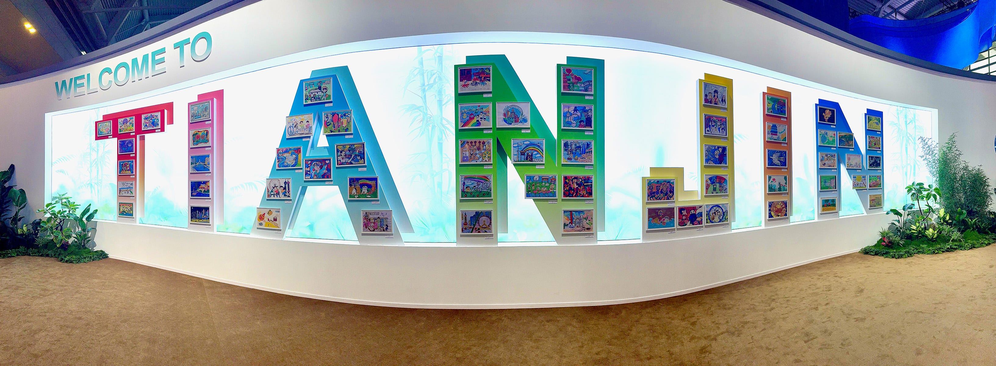 To its left was a display spelling out “TIANJIN” in large letters. And on each letter, paintings by local school children — 61 one of them: