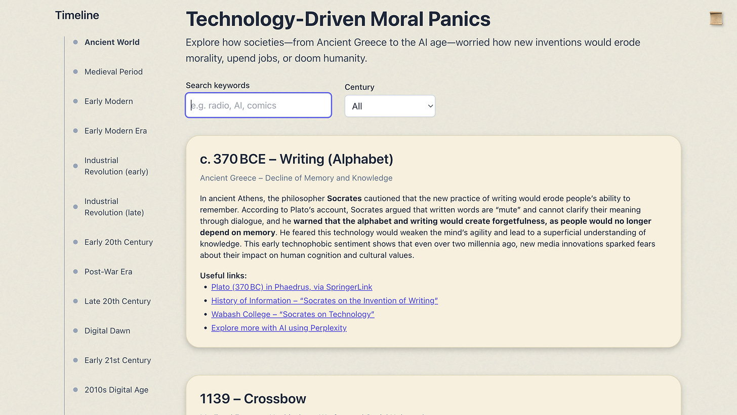 Back to my coffee-fueled idle moment though. Once again finding myself frustrated at the lack of an online timeline that did what I wanted, I asked ChatGPT to whistle up some code for a web page which displayed key moments in the history of technological moral panic on a simple interactive timeline — along with explanatory text that reflected my own work on tech and society.