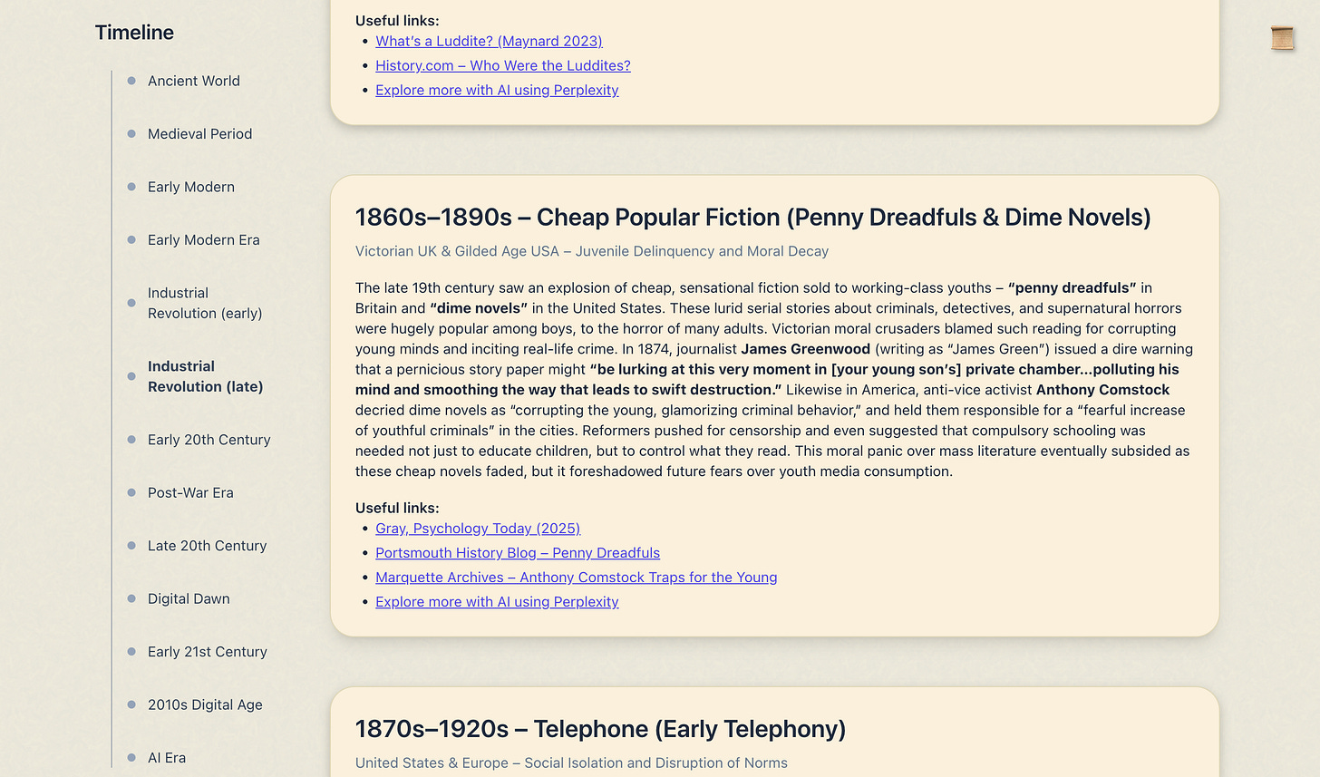 My process was to start by asking ChatGPT (o3) to develop and refine a list of technology-driven moral panics, and to format this as a JSON file. The list — and the JSON categories for each record — took some time to iteratively refine. Next I asked ChatGPT to “create an interactive website using html/js/css that allows people to explore the timeline” — that’s the full extent of the initial vibe coding prompt! The first attempt was OK, but it then took many more iterations and multiple ChatGPT sessions to move from the initial website to something that had the timeline on the left, that was slick and responsive (the timeline moves to the top on a phone), that had an About card that integrated into the page, and that had a feel and look that I was happy with. And while most of this was developed with me showing ChatGPT screenshots and asking it to change aspects of the site (and debug when things didn’t work), there was also quite a bit of manual tweaking on my part.