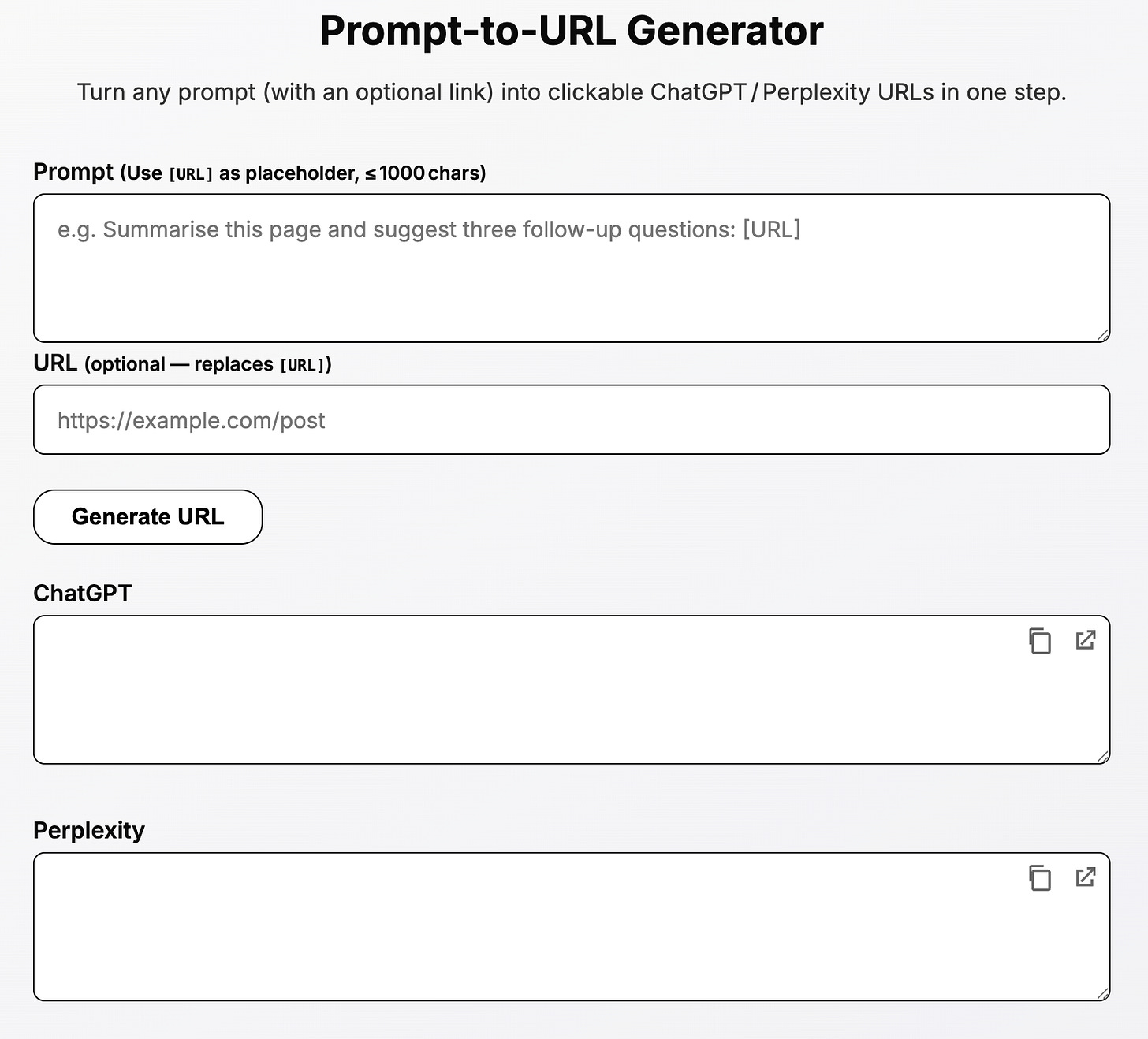 There are only two AI platforms to my knowledge that allow this type of prompt encoding in an URL — ChatGPT and Perplexity — and prompt2url allows you to create a link for either.